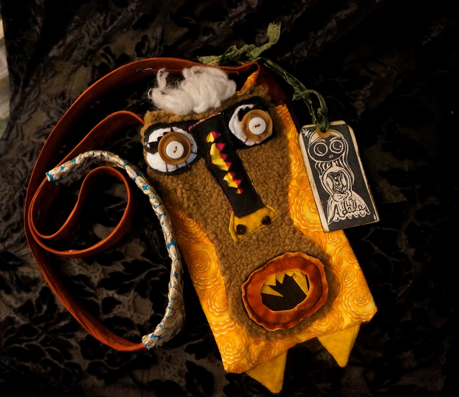 Adorned with buttons, acrylic flowers, charms and fabric stitched on in the